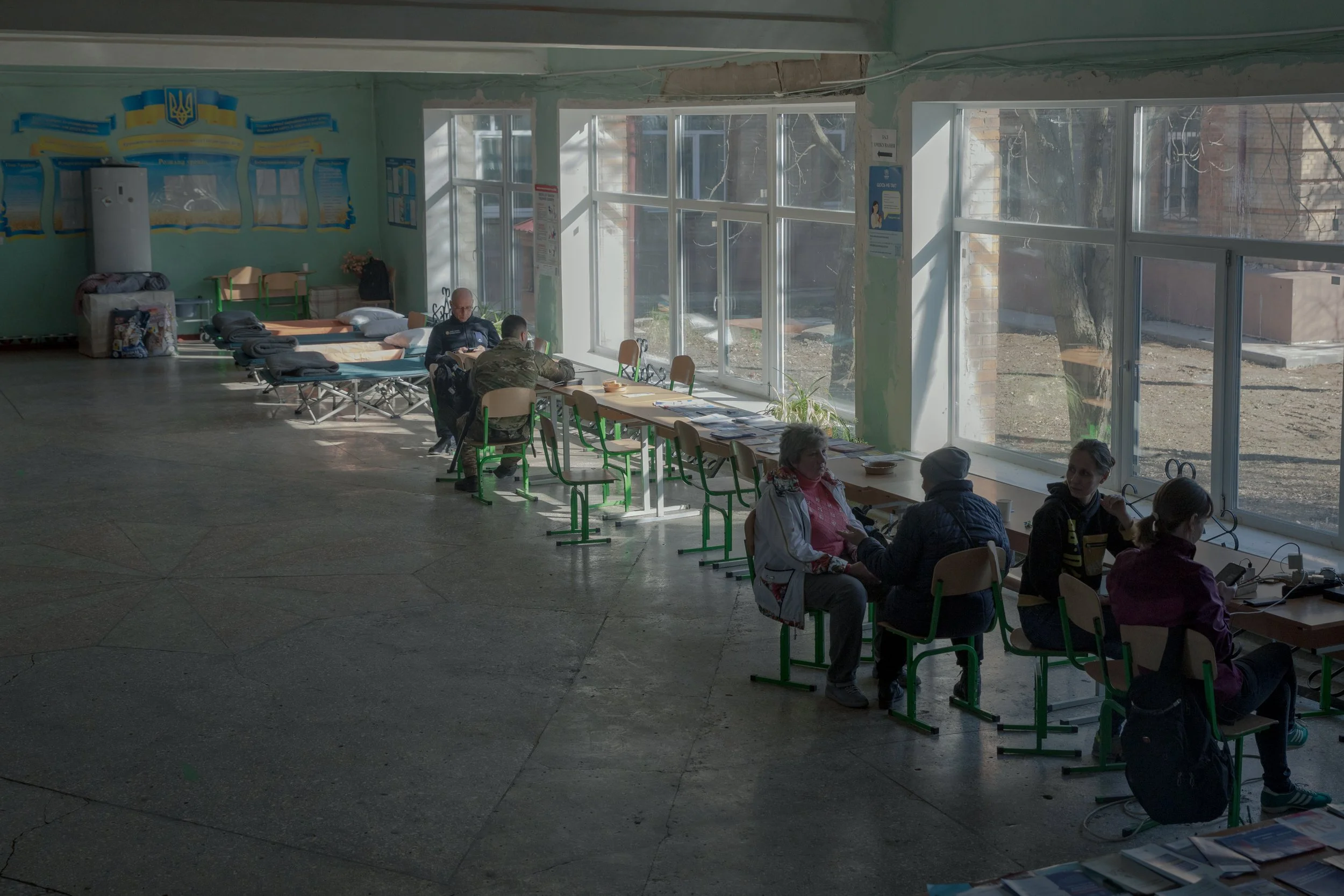 Waiting in a nearby classroom filled with rows of camp beds, three generations of women rest after a high-risk evacuation from the town of Lyman. “We requested evacuation a week ago, and only yesterday we were picked up by Ukrainian soldiers in an armoured vehicle, in the middle of the night,” recalls Tatiana, grandmother and eldest of the group. The family has witnessed the brutality of the frontline. “Shelling is constant, day and night. The Russians are using phosphorus bombs, rockets, artillery and drones.” She is waiting for her husband, who has yet to be evacuated. “Then we will go to the west, away from the frontline.”