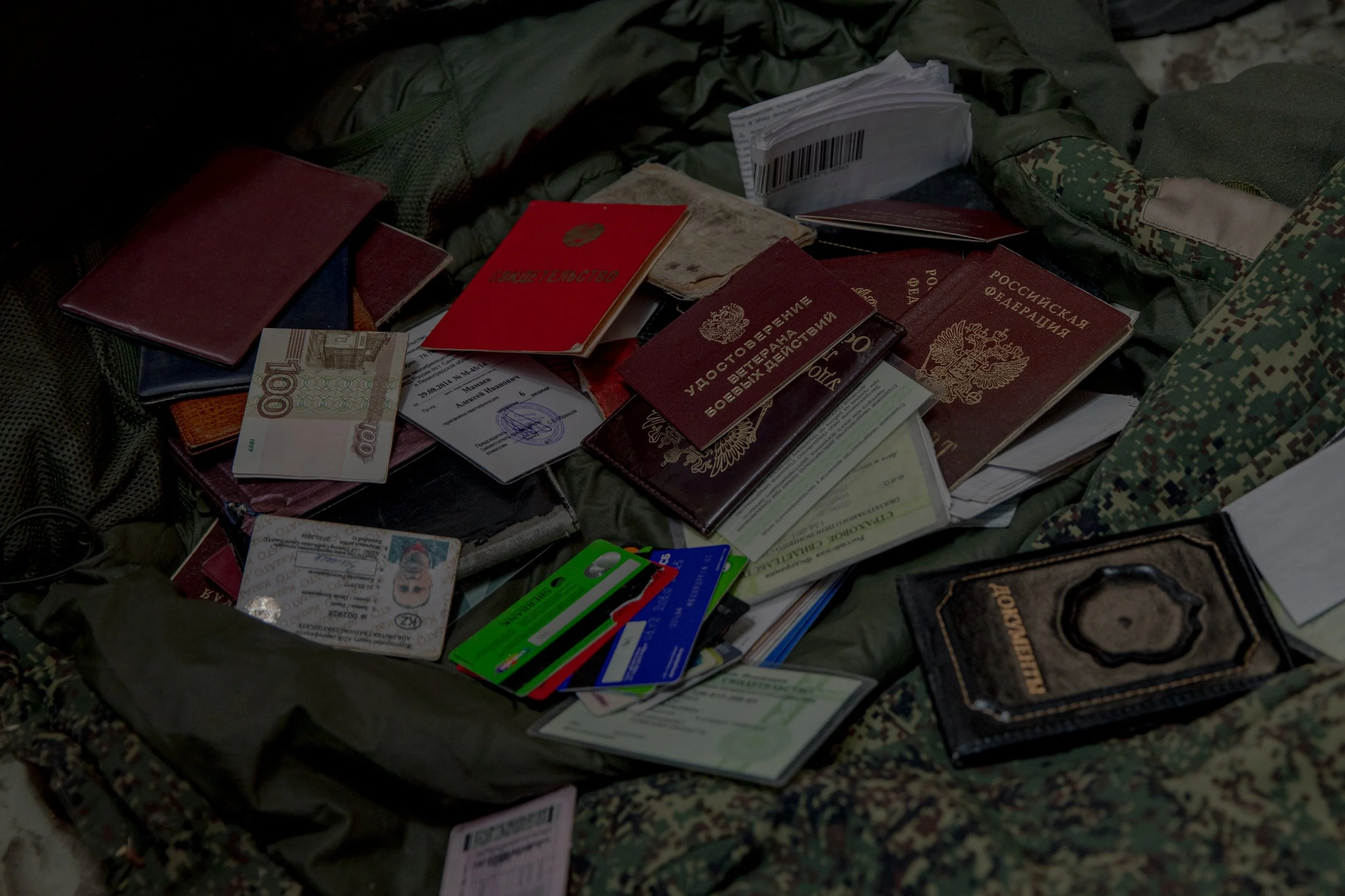 Back on the outskirts of Sloviansk, in the courtyard of a traditional dwelling, bags of ammunition are piled beside body armour and rations. A brawny man with a thick beard, Dzhigit is getting ready to head to his position. Originally from Odessa, he fights in the Nemesis group. Now a drone pilot, he has been on most fronts since 2022 and has the souvenirs to show for it. From under his bed, he pulls out a cardboard box wrapped in a crumpled Russian uniform. He spills its contents across the digital camouflage: dozens of documents that once belonged to Russian soldiers. Passports, driver’s licenses, credit cards, cell phones. “I have never called their families. Not mothers, grandmothers, children. It’s not moral,” he says with a sombre expression.